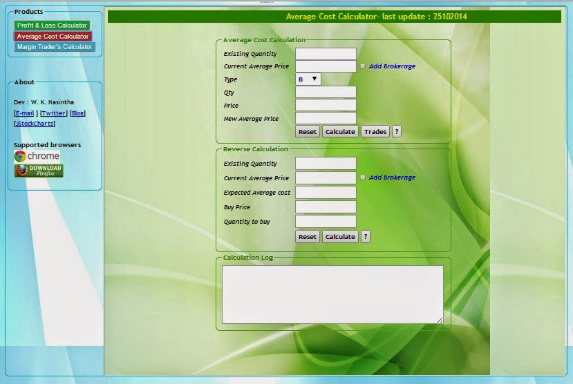 Hey there Fellow readers, After an hectic period immersed in studies I have some time to look back into Trading calculators one of these days. Hence fresh improvements in my projects can be expected in coming weeks. First of such improvements goes in to Average Cost calculator (AVC), wherein I have made major overhaul in the code. So the changes may not be apparent. But the UI looks good , the code looks good so I feel much better. And I'm pretty confident that It could be made to a more robust application. Major changes was made to JS code to optimize and avoid redundancies.